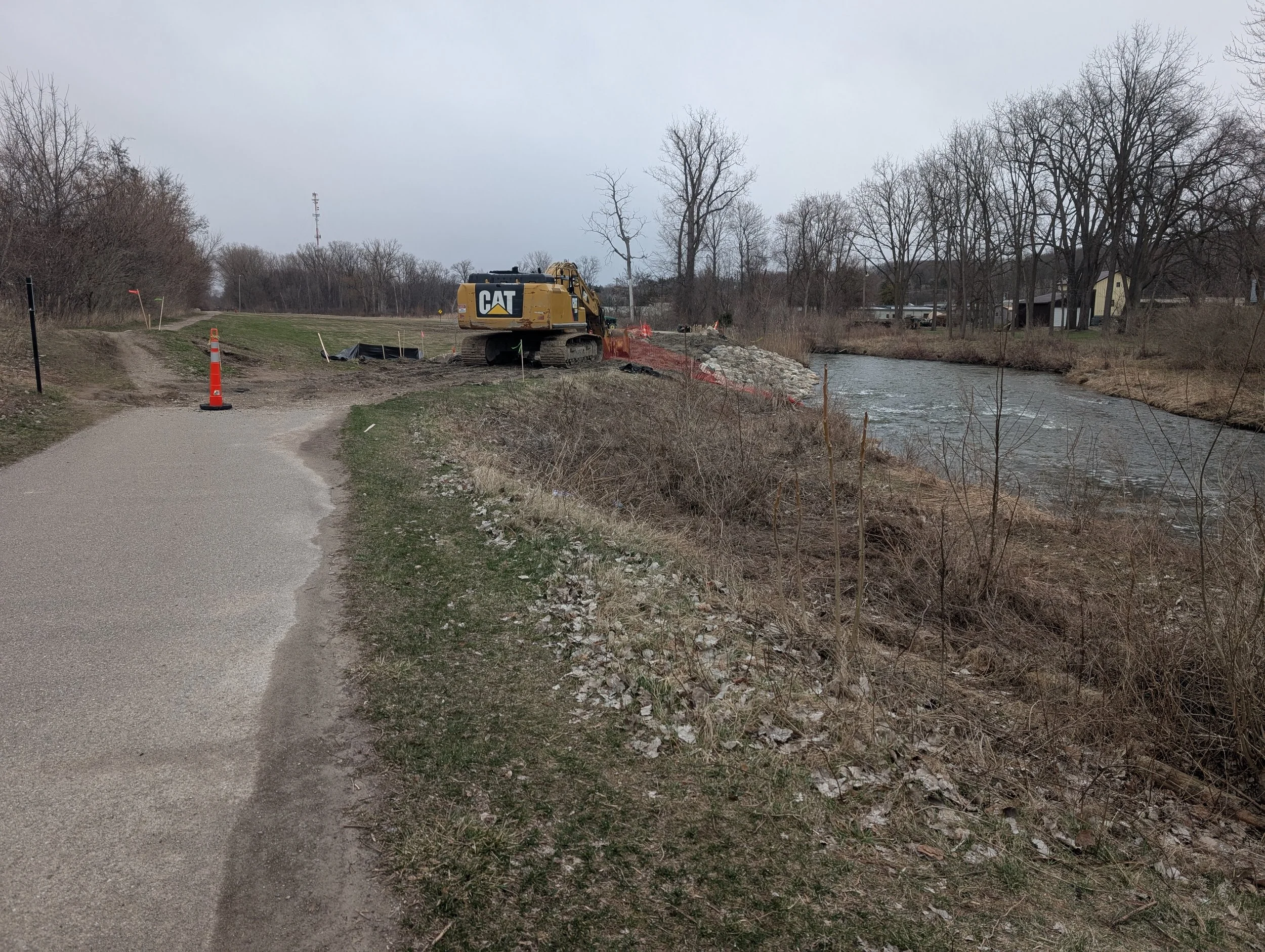 The Clinton River began to undercut a retaining wall supporting the trail near Diversion St in Rochester. Eventually, the wall collapsed. The river bank is now being fortified and the grade decreased, and the trail is being pushed back several feet to avoid this issue in the future.